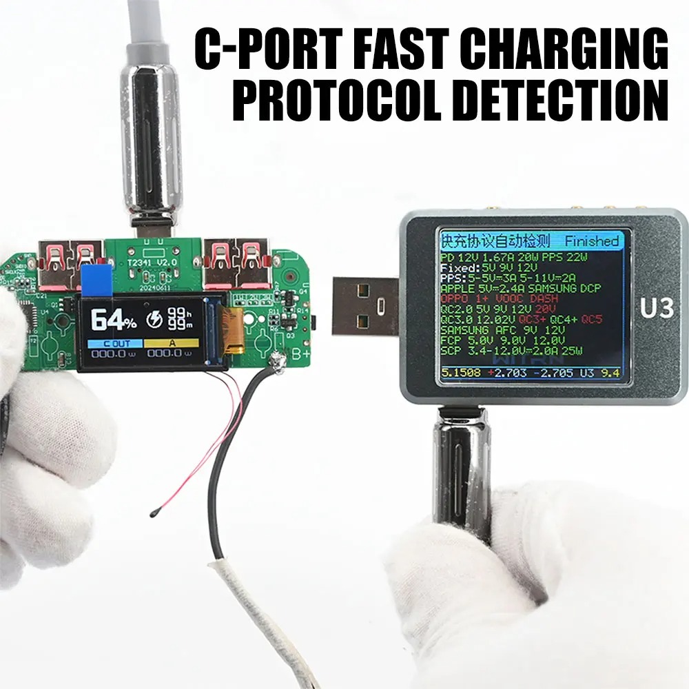 پروتکلهای پشتیبانیشده شامل PD، QC، APPLE، FCP، SCP و VOOC است، بنابراین عملاً اکثر برندهای رایج (سامسونگ، شیائومی، هواوی، اوپو و…) روی حالت شارژ سریع با آن سازگار خواهند بود، به شرط اینکه خود گوشی از پروتکل عمومی پشتیبانی کند. نمایشگر TFT رنگی برد در لحظه ولتاژ، جریان، توان، دما و سطح شارژ را نشان میدهد و پس از چند سیکل، با «یادگیری خودکار ظرفیت» دقت نمایش درصد باتری را بالاتر میبرد.