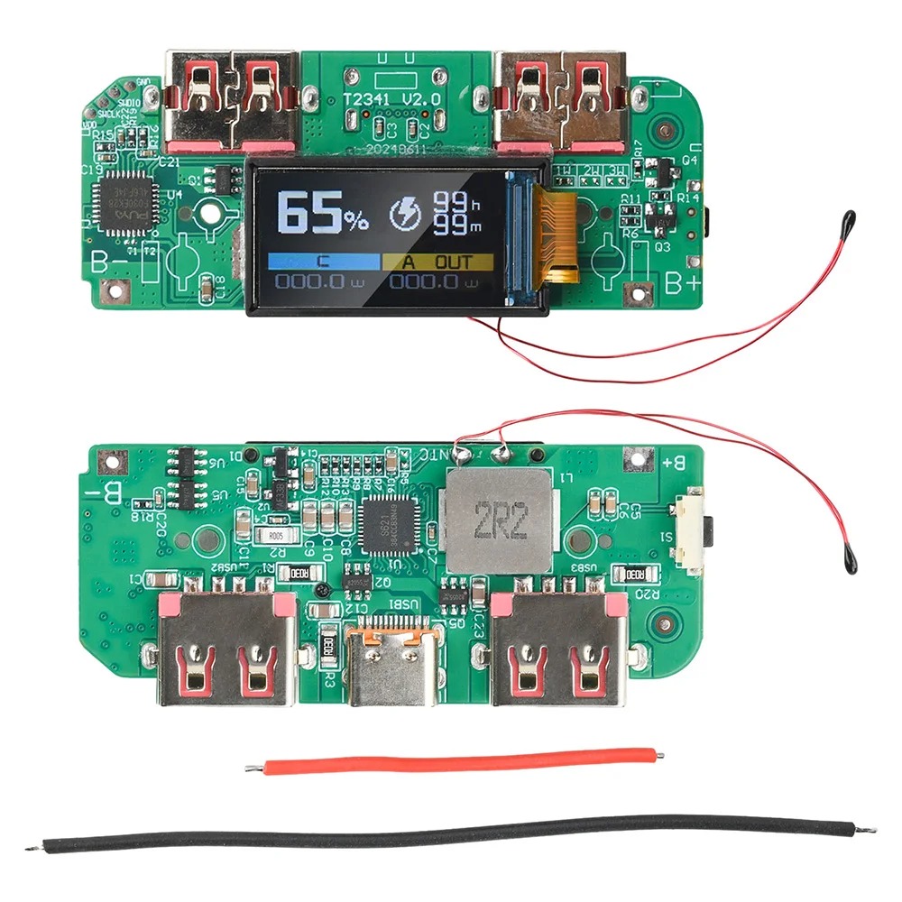 این برد، یک «ماژول پاوربانک شارژ سریع دوطرفه ۲۲.۵ وات با نمایشگر رنگی و PD» است که با اتصال مستقیم چند سل لیتیوم ۳.۷ ولتی (بهصورت موازی) آنها را به پاوربانک هوشمند تبدیل میکند. روی برد یک پورت Type‑C دوطرفه (ورودی/خروجی) و دو خروجی USB‑A سریع وجود دارد که میتواند همزمان چند دستگاه را تغذیه کند، هرچند شارژ سریع فقط روی یک مسیر در لحظه فعال میشود.