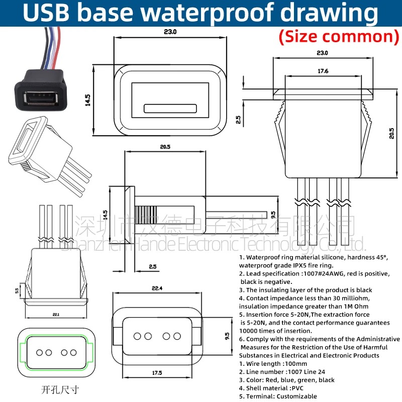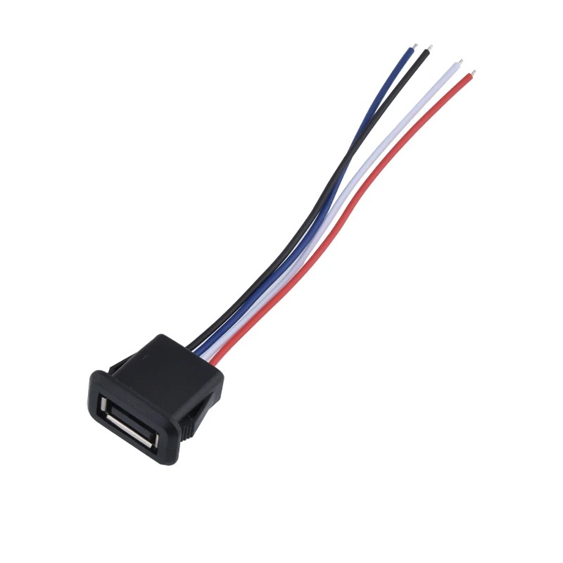 این محصول یک سوکت USB 2.0 Type‑A مادگی پنل پایهدار و ضدآب است که برای نصب دائمی روی بدنهی جعبه و پنل دستگاهها طراحی شده است. حلقهی آببندی سیلیکونی با سختی حدود 30 تا 45 درجه و کلاس حفاظتی IPX5، مقاومت مناسبی در برابر پاشش آب و رطوبت محیطی فراهم میکند و پورت USB را برای استفاده در فضاهای باز و محیطهای مرطوب ایمن میسازد. سیملیـدها از نوع استاندارد 1007 با سطح مقطع 24AWG و عایق PVC مشکی هستند و معمولاً سیم قرمز بهعنوان مثبت و سیم مشکی یا سبز بهعنوان منفی استفاده میشود. استفاده از هادی مناسب و طراحی صحیح، مقاومت تماس را پایین و عایقبندی را بالا نگه میدارد و عبور جریان شارژ ۵ ولت USB را بدون افت ولتاژ محسوس و با ایزولاسیون قابل اعتماد در محیطهای مرطوب ممکن میکند.