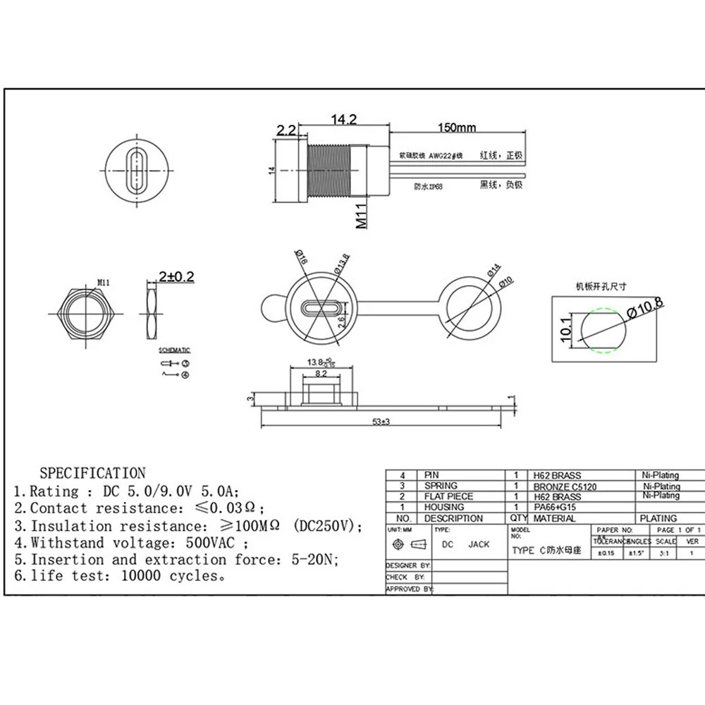 - ابعاد مکانیکی: مهره M11 برای نصب پنلی، قطر برش پیشنهادی Ø10.8 mm و جزئیات ابعادی برای طراحی برش پنل و PCB.