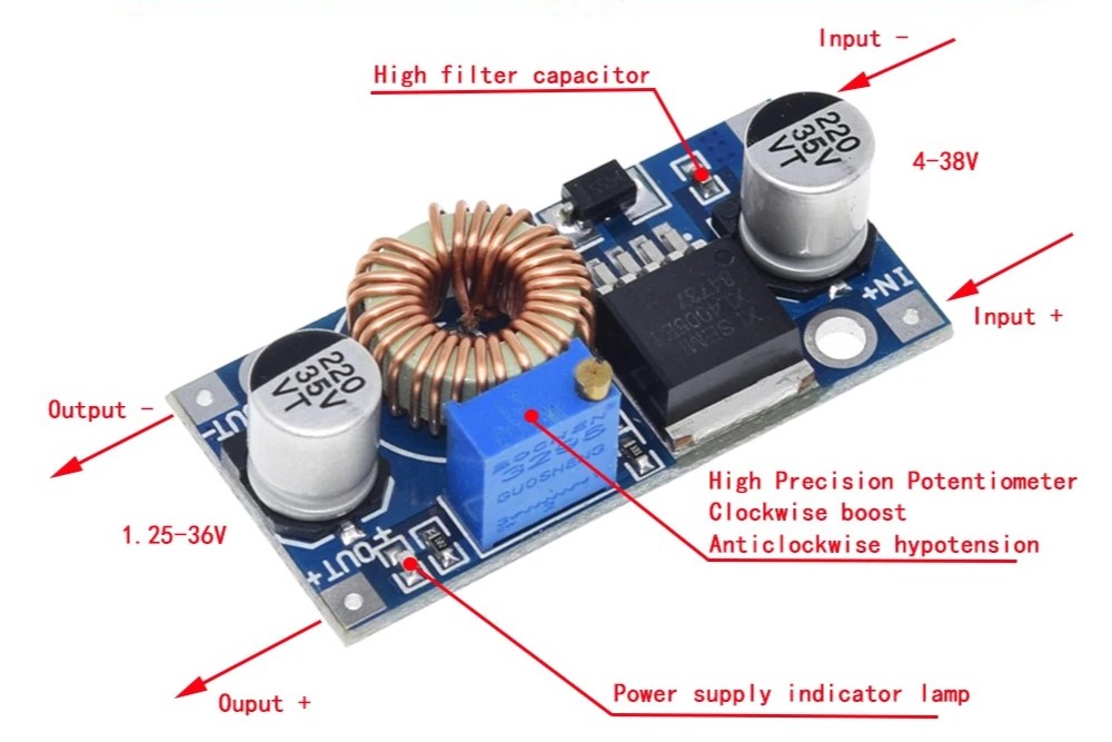 - Wide Input Voltage Range: The module supports a wide input voltage range, typically from 4V to 40V, allowing it to be used with a variety of power sources, including batteries, power supplies, and solar panels.