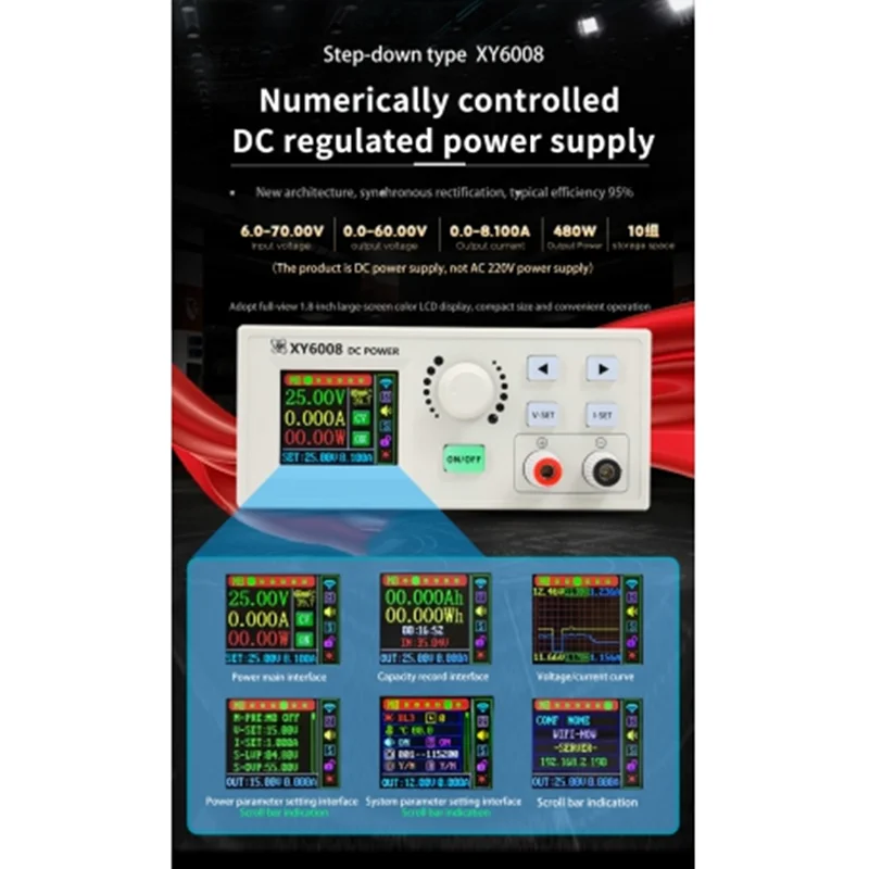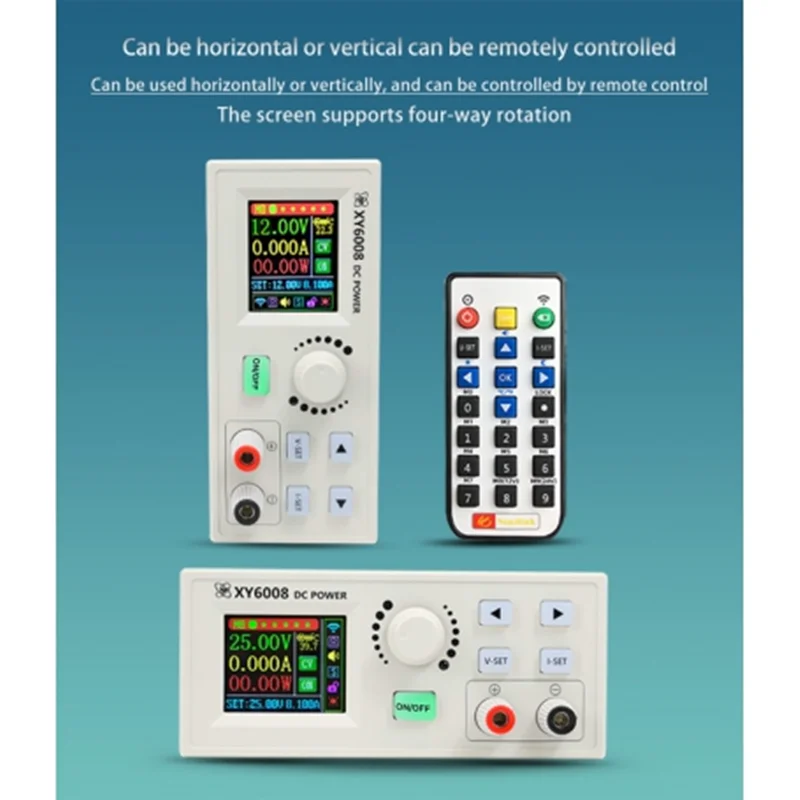 منبع تغذیه هوشمند XY6008 متغیر 60V 8A 480W دارای استابیلیز ولتاژ و جریان به منظور تامین توان تجهیزات حساس همانند دستگاه های CNC، ابزارهای اندازه گیری و آزمایشگاهی به همراه ریموت کنترلر می باشد.این ماژول کاهنده DC به DC هوشمندمی باشد.دستگاه دارای یک نمایشگر رنگی با امکانات بسیار متنوعی از قبیل کنترل جریان و ولتاژ دقیق، محاسبات مختلف توان، رسم نمودهای مصرف ولتاژ و جریان و ... می باشد.پنل نمایش دستگاه دارای امکان ویژه ای به منظور ارزیابی ولتاژ، جریات و توان مصرفی هستند.شما می توانید تا 63 ولت DC را به ورودی این ماژول متصل کرده و در خروجی بین صفر تا 60 ولت را دریافت کنید. با توجه به خروجی 8 آمپری و امکانات نرم افزاری بسیار پیشرفته، می توانید انواع مصرف کننده های جریان بالا همانند موتورهای DC را راه اندازی و پارامترهای مصرفی آن ها را بررسی نمایید.